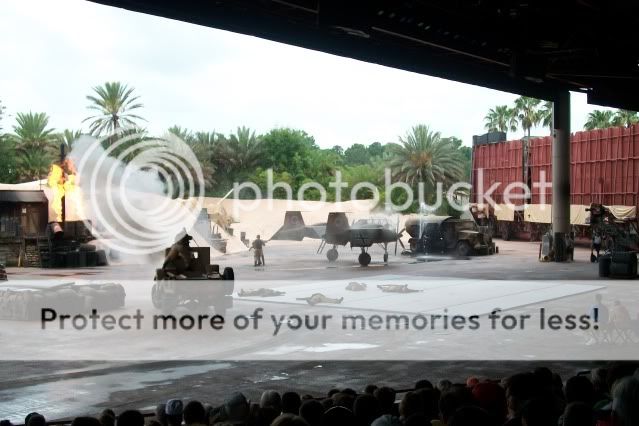 Entramos tras una espera de unos 20 minutos entre maquetas usadas para el rodaje de Pearl Harbour. La atracción ha introducido cambios desde la vez anterior. Ahora se divide en dos partes: una recreación de los efectos especiales de Pearl Harbour (esto es nuevo) y el paseo por el interior de los estudios en un trenecillo, con la guinda final en Catastrophe Canyon.